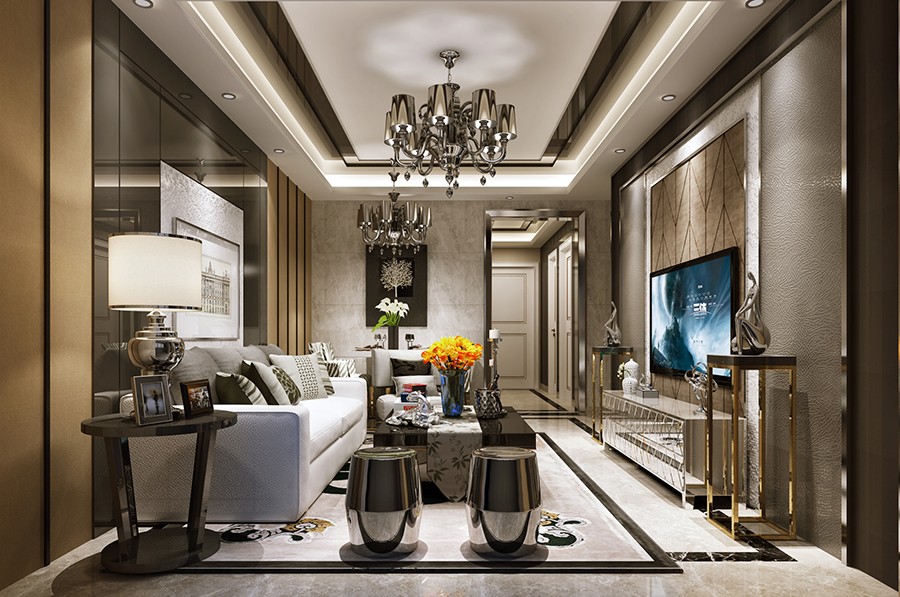 客厅家具米黄色的空间,白色的家具,打造一种淡雅而浪漫的高颜值客厅。欧式风格的沙发柜,金色镶边的电视柜,承担起客厅的收纳空间,让客厅看起来更加简洁明了。