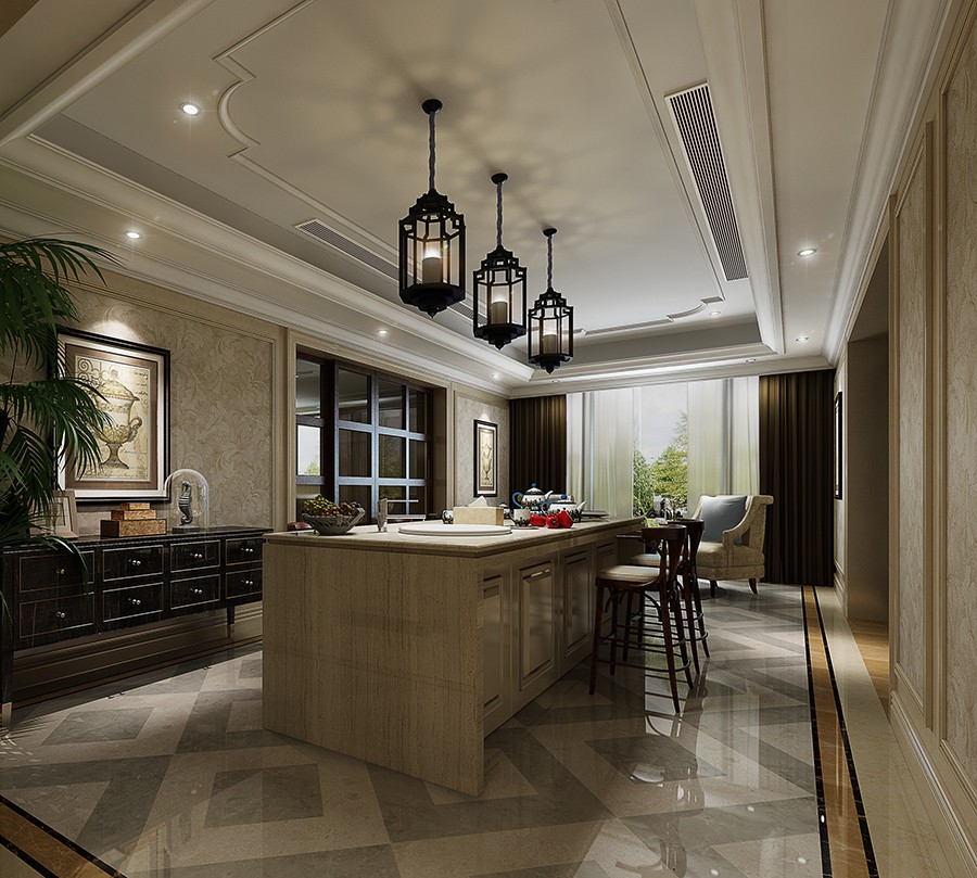 餐厅家具餐厅摒弃了传统的餐桌椅,采用了小吧台的设计,更加符合上班族追求高品质生活。黑色的餐边柜散发着优雅的气息,落地窗旁的沙发椅,提供了一个休息之地。