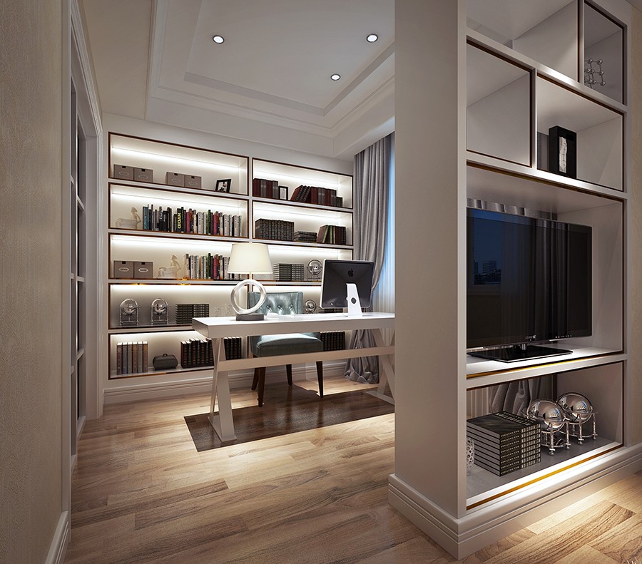 书房家具书房与客厅相连接,用展示柜作为隔断,划分出两个空间。嵌入式的书柜,不占据任何的空间面积,开放式储物格,可以很多将图书区分,想要任何图书,都可以尽收眼底。