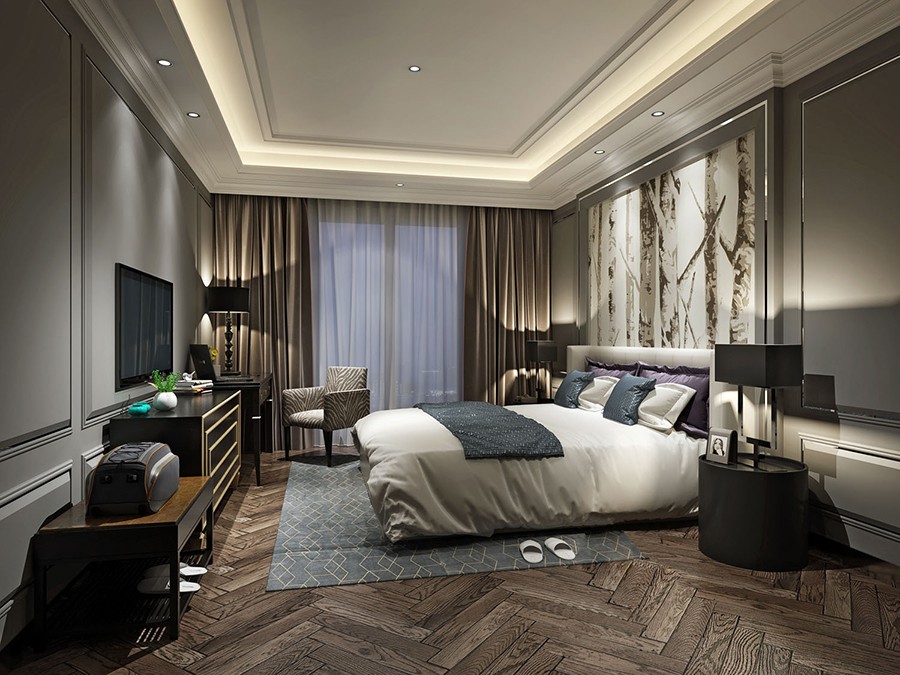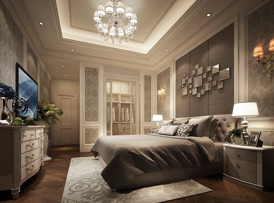 主卧家具黑色过于沉重,白色过于简单,灰色却给人带来一种宁静。主卧以灰色为主色调,用白色进行点缀,简洁高雅的欧式家具,在这个宁静自然的空间,更加富有魅力。白色电视柜,灰色的床头柜,独立的衣帽间,随心所欲的生活,更加放松人们的心情。