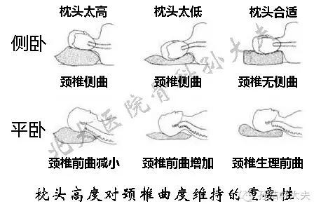 首先,枕头高度的选择至关重要。枕头的高度与睡姿有关,可以根据自己平时仰卧睡姿多还是侧卧睡姿多来选择。侧睡时需要带硬支撑的高枕头,仰睡时需要薄一些的枕头;仰睡时枕头的高度和拳头等高为宜,侧睡时则与一侧肩宽等高,当然需要根据每个人的生理特点来进行相应的调整。当枕头的高度过高时,不能保持颈椎正常的前曲弧度,会加重颈椎负担,增加背部肌肉紧张,肩部酸痛, 头痛、头晕、耳鸣及失眠等脑神经衰弱等,加重颈椎病的症状;而当枕头高度过低时,会出现颈肩部的酸痛,还会使头部充血,造成眼睑和颜面浮肿,容易张口呼吸,出现打鼾的情况。