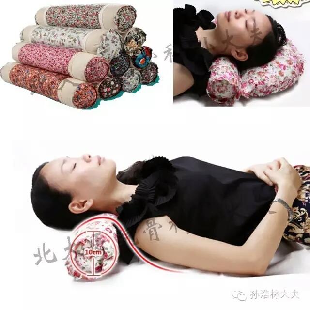 小贴士:这种小圆枕可以作为短时间的颈椎后仰锻炼辅助工具,如果长时间枕着睡觉,就需要在头部再加一个薄枕头。