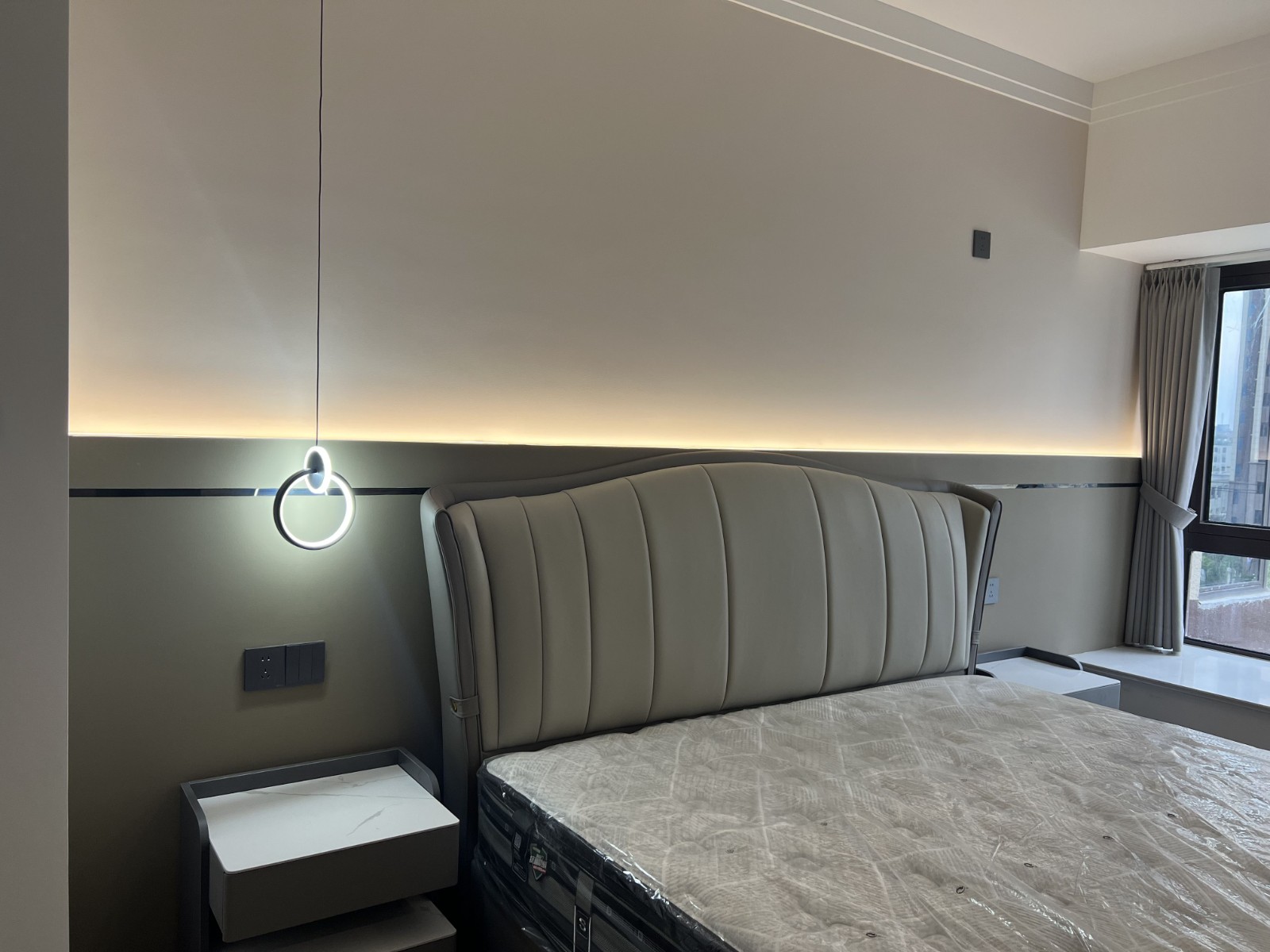 床头两侧各有一盏中古壁灯,可以独立控制,贴心的设计增加了生活便利性。