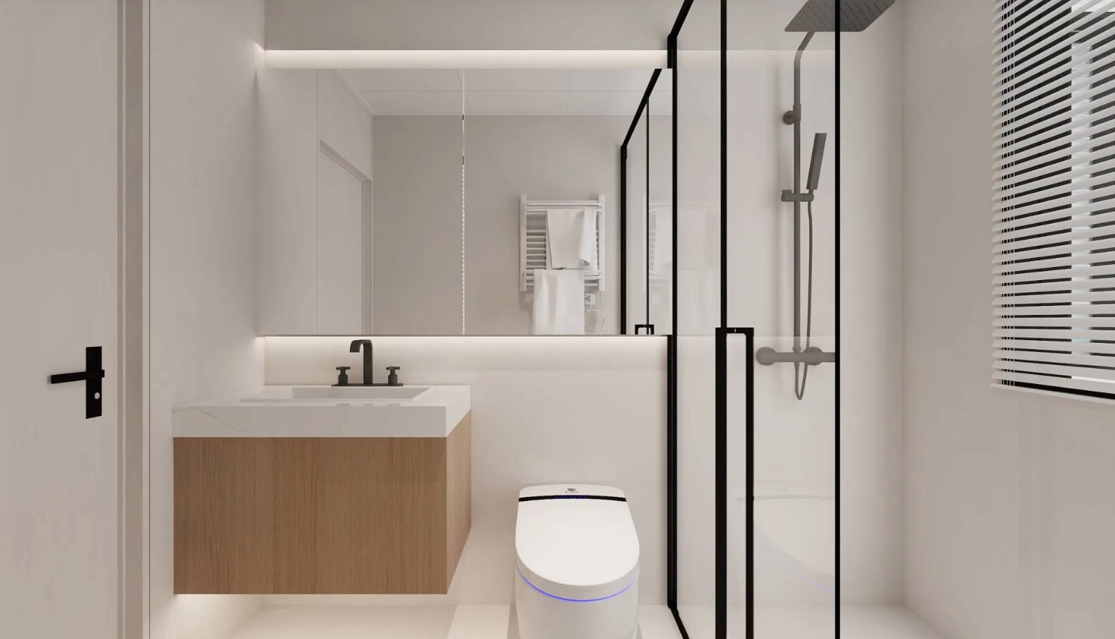 淋浴房也是原木木饰面,灯光色温,墙地砖选配,呈现效果