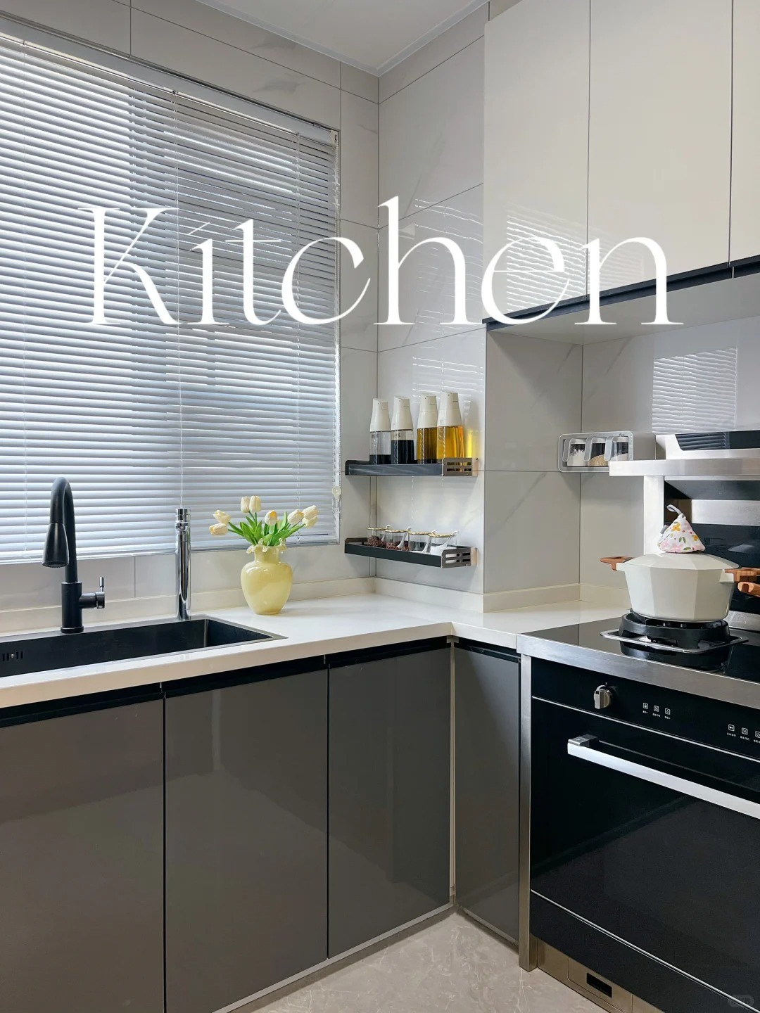 采用灰白黑经典配色,简洁大气。操作区布局紧凑合理,满足洗、切、炒等一系列烹饪流程。黑色水槽与龙头增添时尚感,窗边的绿植点缀,让烹饪也成为一种享受,适合喜欢简约高效烹饪的生活方式。