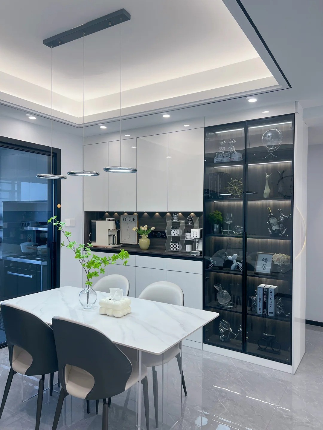 以白色为主调,搭配大理石纹理地面,尽显奢华。电视墙的独特造型和灯光设计,提升空间格调。开放式的客餐厅一体化设计,方便家人互动和待客,营造出宽敞明亮、大气的居家氛围。