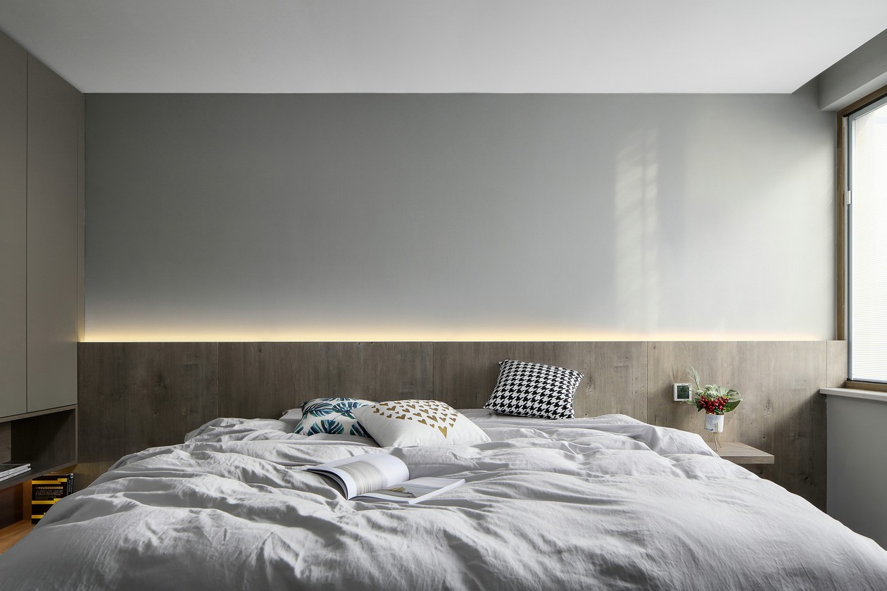 主卧硬装造型致展现出强烈的现代感,床背景挂画用亚克力与纯净的、肌理特殊的白,进行材质上的对比。将颜色主要集中在床尾凳、窗帘、电视背景挂画上,用素雅***的灰色,突显质感。