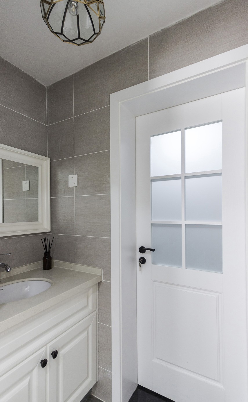 卫生间也设计了干湿分离,干区在外,墙面是浅灰色的大理石纹理瓷砖,地面采用与墙面一样的大理石纹理瓷砖