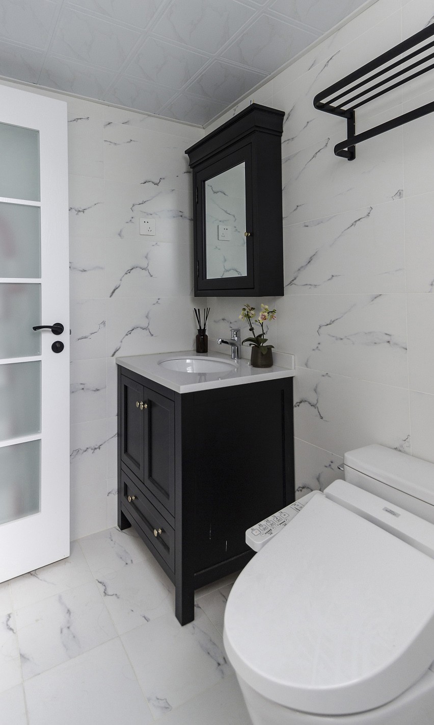 为提升空间色彩,黑色的洗漱台与置物架,一深一浅,让空间更加丰富。