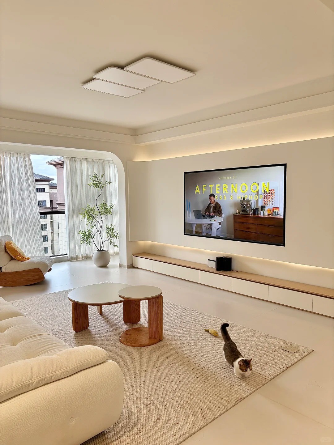 电视墙整片文化砖铺贴 三个隔板能够储物书籍,白色沙发 搭配地毯,北欧风