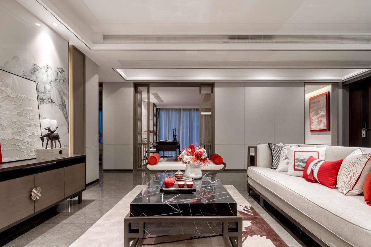 客厅空间整体简洁明净,现代感十足又不缺乏韵味的沙发茶几,明快而透亮将东方哲学与当代人的审美情趣完美融合。