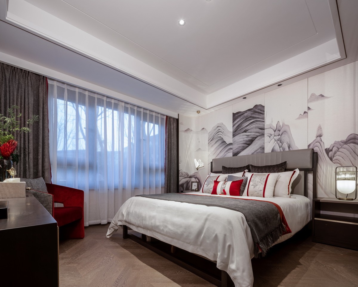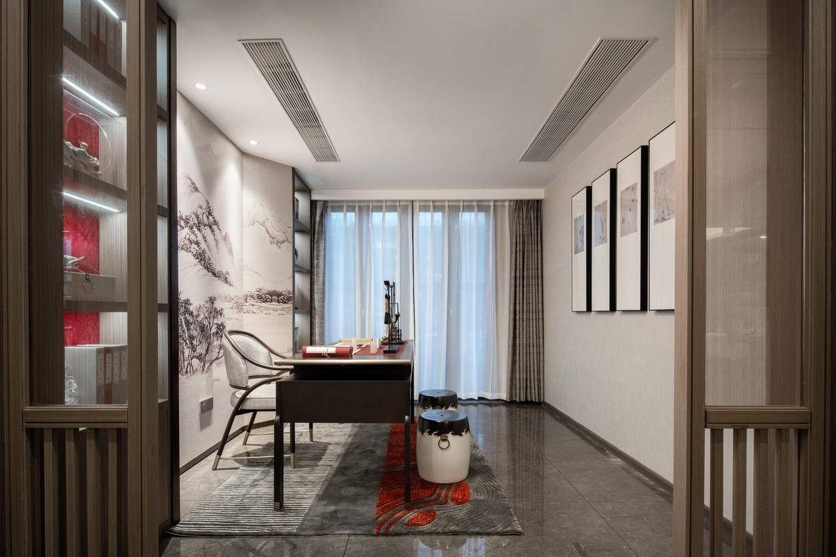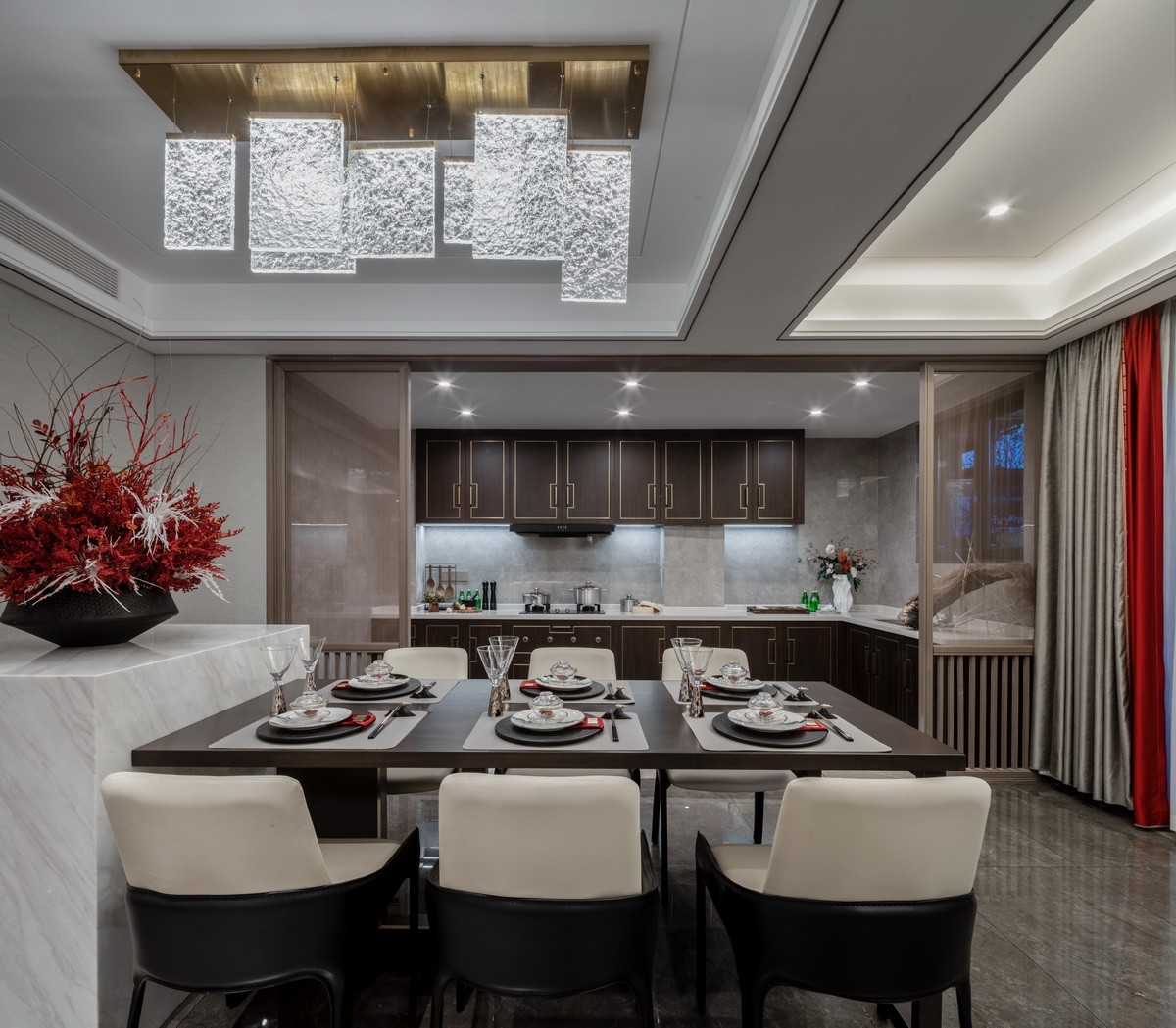 房屋设计以沉稳大气的深木色作为硬装底色,配以实木、棉麻布艺、天然大理石,朱红色的陈设色调,空间元素紧扣当地潼南的地域文化,铺叙空间美学层次……