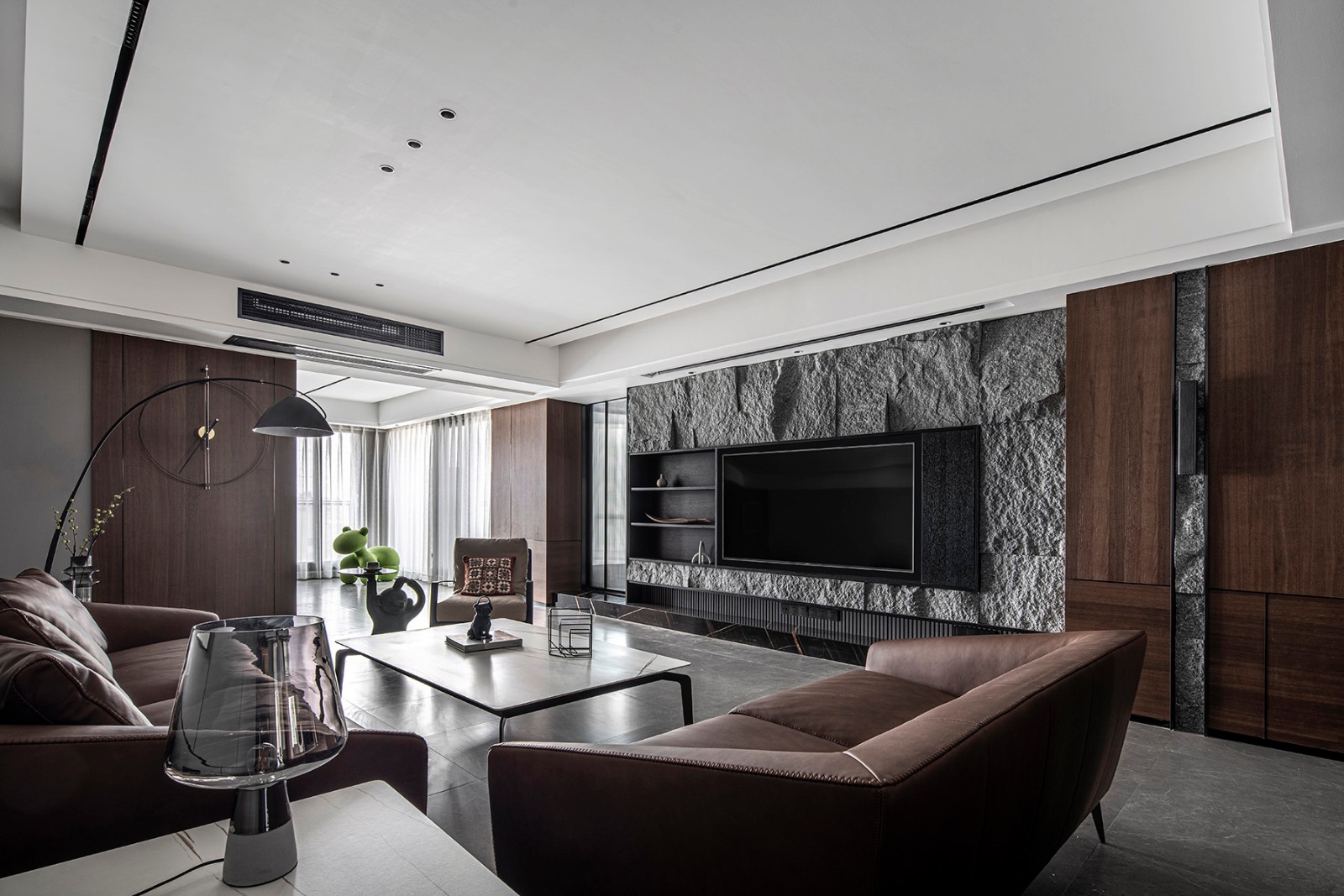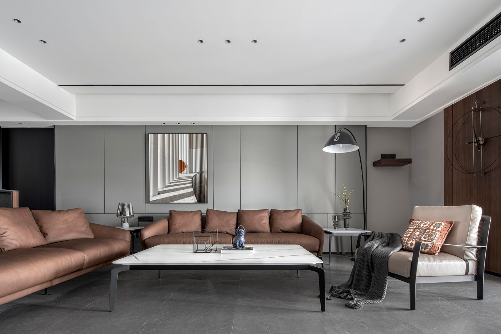步入客厅,俯仰之间,完整的感受到了灰色调与胡桃木色调的碰撞、穿插。设计师利用色块的交叠,将立面造型与空间功能层次做了完美的结合。