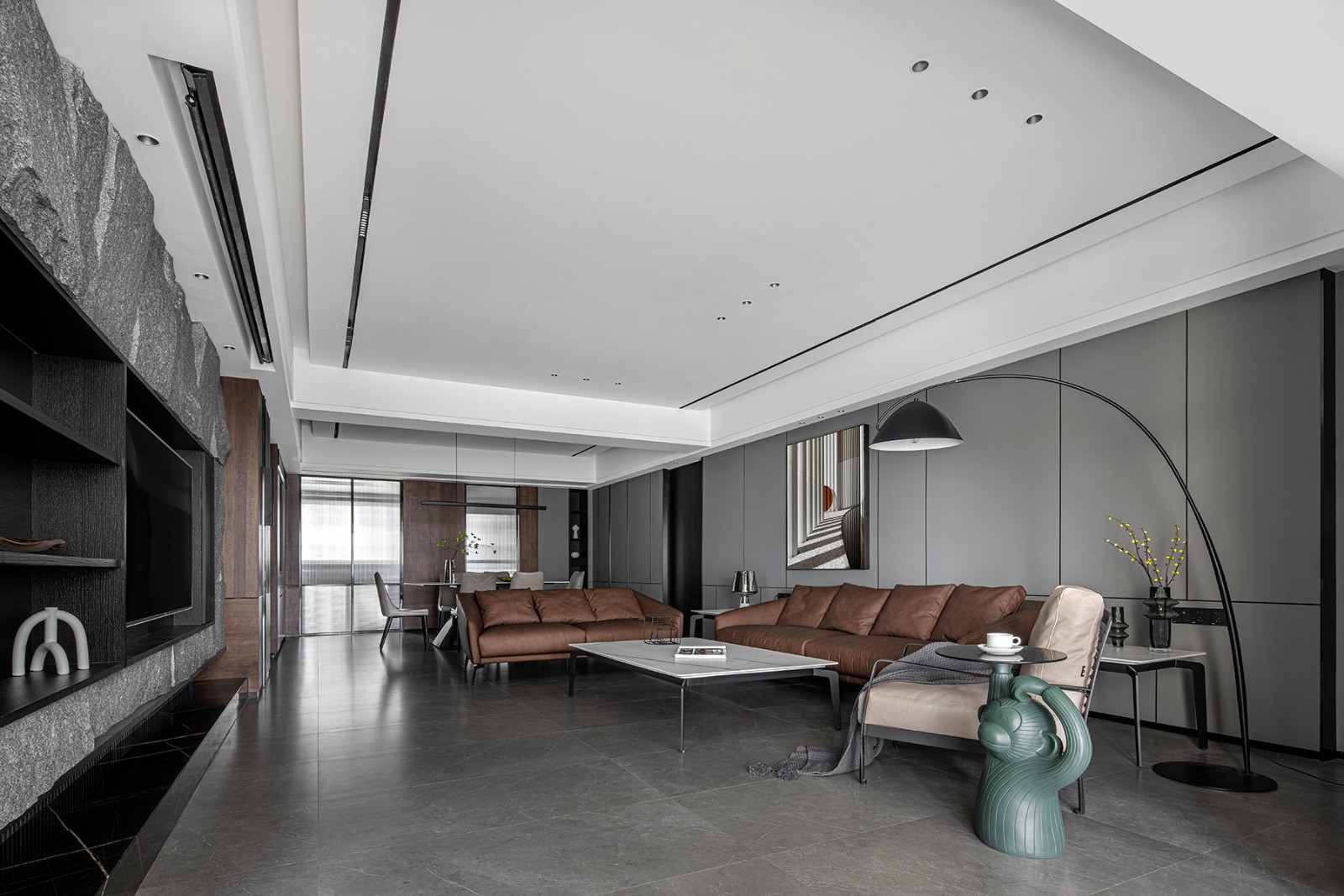 客厅摒弃了传统主灯,采用了围绕灯带的设计来营造整体氛围。从墙体到地面,黑、白、灰的现代质感充盈着,与棕色皮质沙发相映成蕴,让人的心,不由自主就沉浸下去、沉静下来。