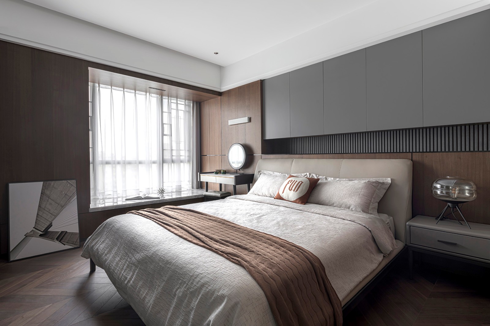 主卧的墙面与整体居室统一,用胡桃木的天然质朴,营造出宁静安然的氛围。设计师注重连贯的空间感,将地面也更换为同色系的木质地板,增加了一份静谧与整洁。