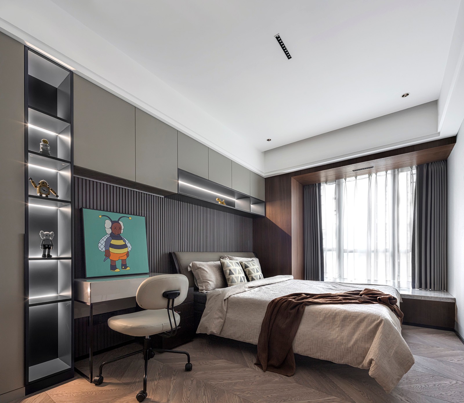 男孩的房间以黑白为主色,胡桃木色的窗台软包更显大气。耸立的展示柜,为小主人留出了心爱之物的空间,***的拟人画,则富有童趣。