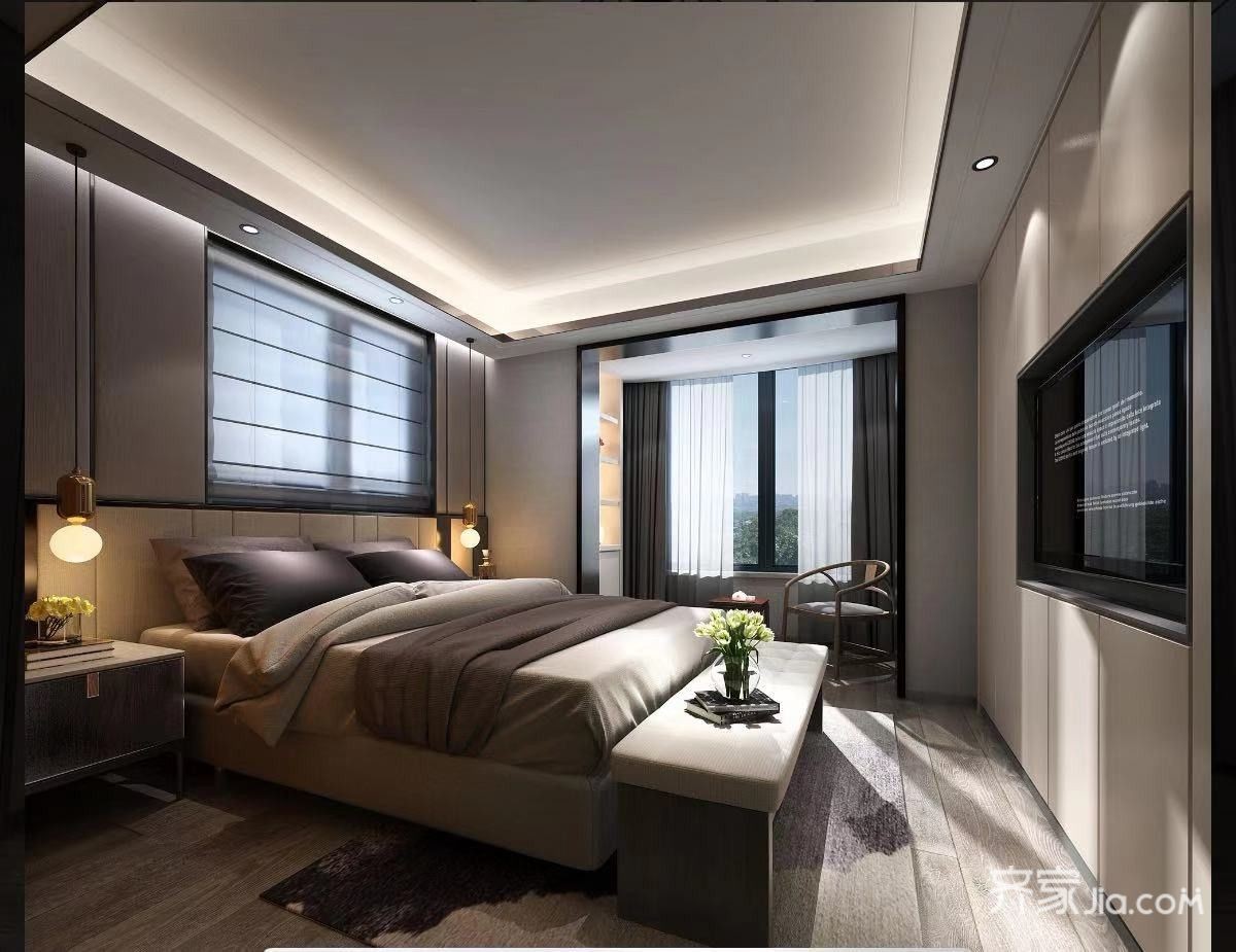 主卧室床头有一面窗户,设计师结合整体造型做了一个背景虚化处理,卧室一排衣柜放常用衣物,还有独立衣帽间。