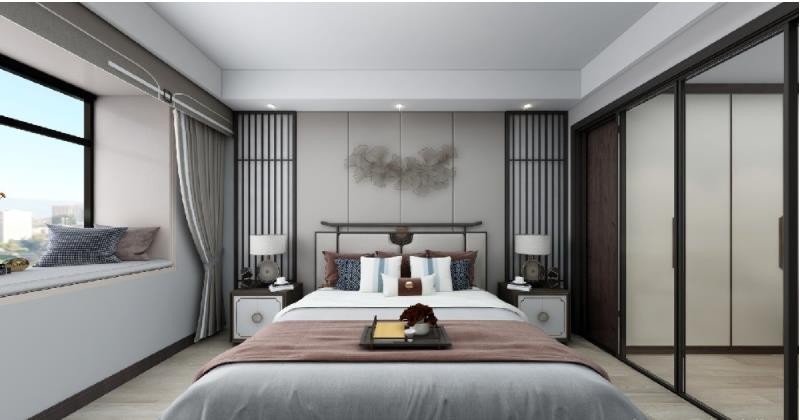 背景采用中式格栅和现代硬包相结合的方式,墙面使用嘉宝莉涂料