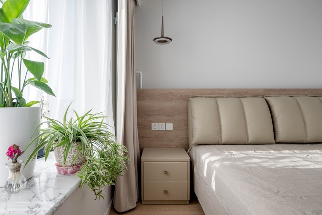 床头左侧设有床头柜,可以用来放置手机、书等随手物品。窗帘颜色与床头软装颜色相呼应,温馨典雅。 窗台绿植让卧室更有生命力。
