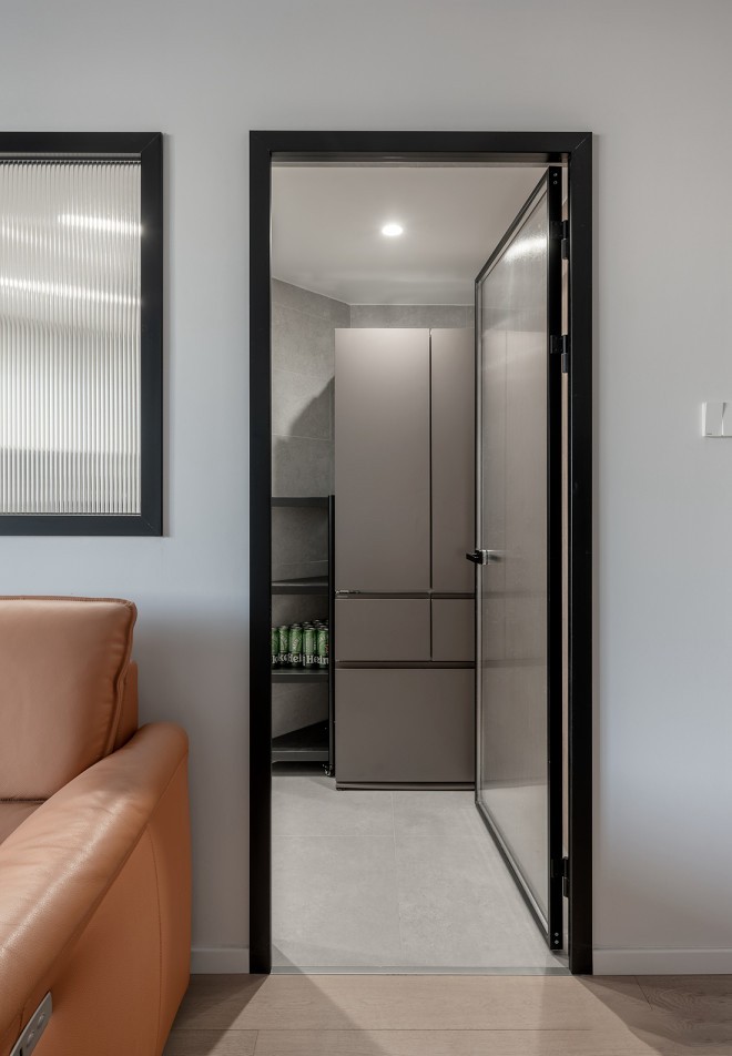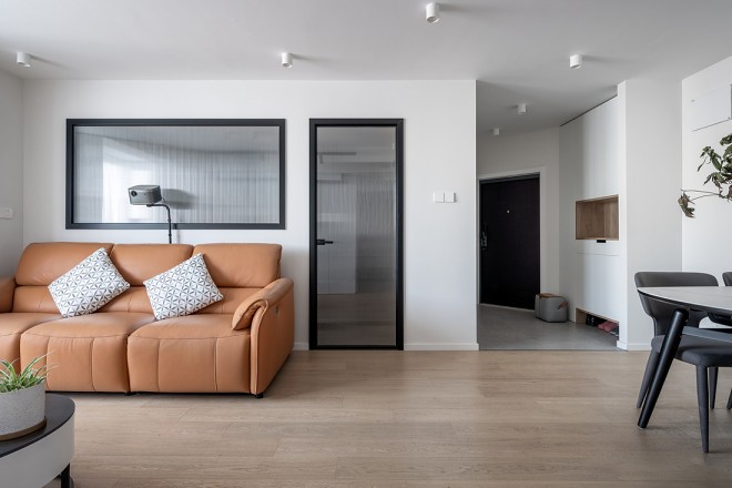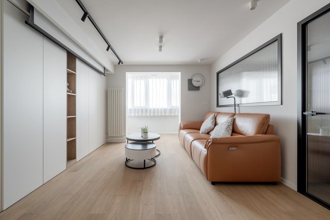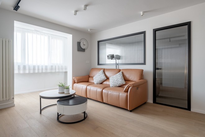 沙发后面半透明玻璃墙,不仅可以增加厨房采光,也可以让整个空间更加通透。 皮质沙发虽然尺寸不大,但坐感极其舒适、更有质感,具有装饰感的颜色,使客厅即便没有多余装饰,看起来也不会过于单调。