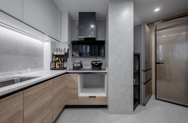 拐角处放置调料架,既方便拿取,又能充分利用空间。 灶台下方留有空间,可以放置蔬菜或者常用小家电,方便拿取。