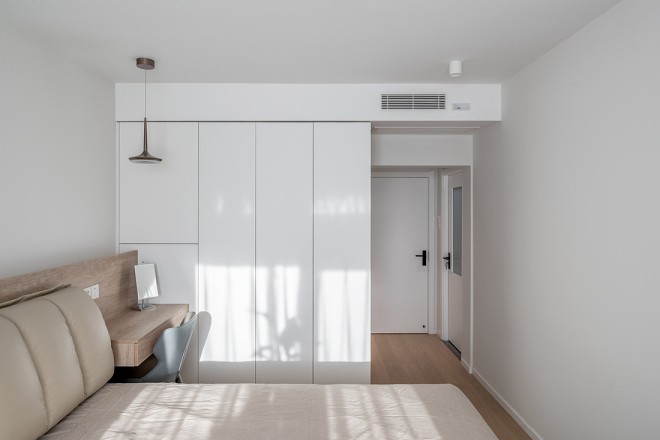 整体白色衣柜同样采用无把手按压式柜门,简洁大方。