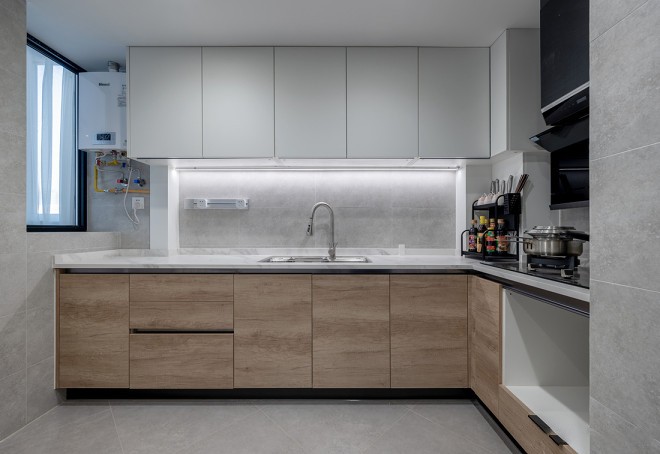 原木风橱柜,在清新自然的基础上增加了一份质感,让女主人更加享受烹饪的过程。 上方一排储物柜极大的增加了厨房的储物空间,墙上可移动插排方便厨房家电的使用。