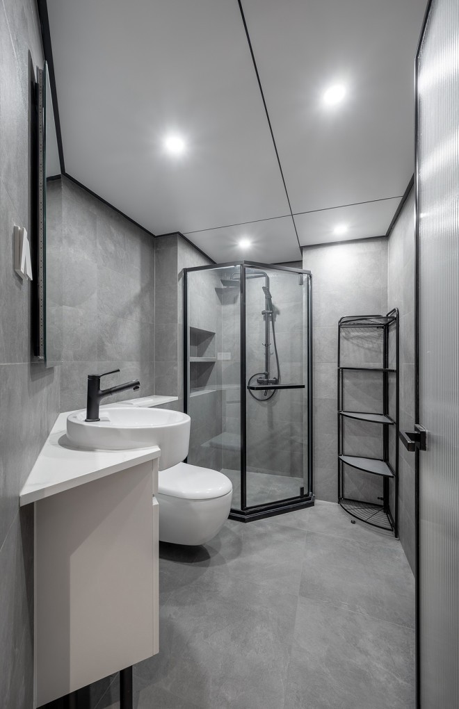 简洁干净的卫生间由独特肌理的材料整体铺设,与整体相得益彰,是美学与经典的融合。 客卫采用干湿分离,防止洗澡时有水溅出,壁龛设计在方便放置物品的同时又能节省空间,墙角处置物架可以放置洗漱用品。