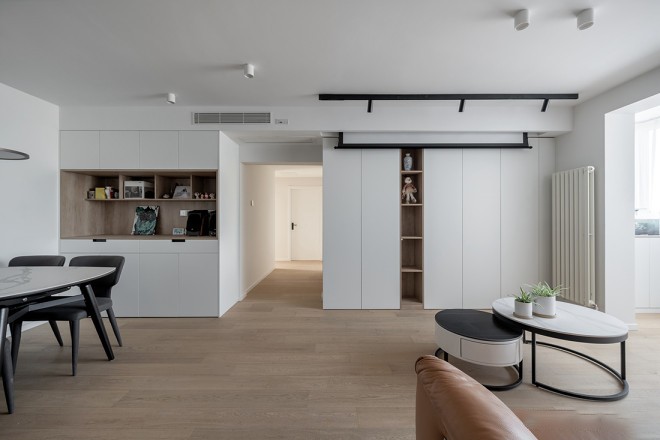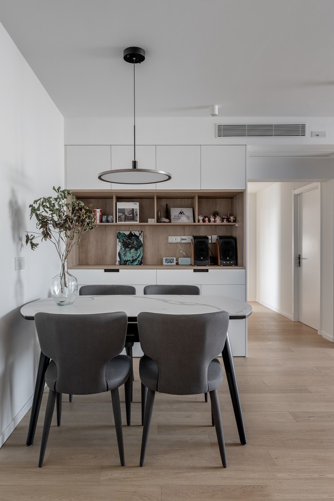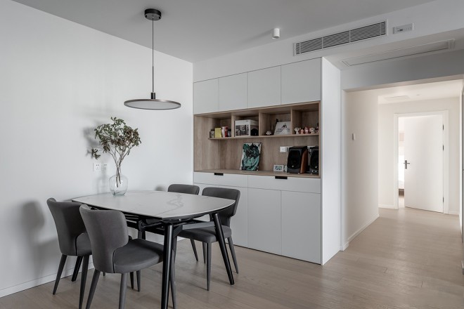 餐桌旁边是一面到顶餐边柜,白色柜门同样采用无把手按压式,干净利落。 中间原木色空间可以用来摆放装饰品或者小家电,又可以使颜色看起来不会太单调,墙上插排为小家电的使用提供便利。