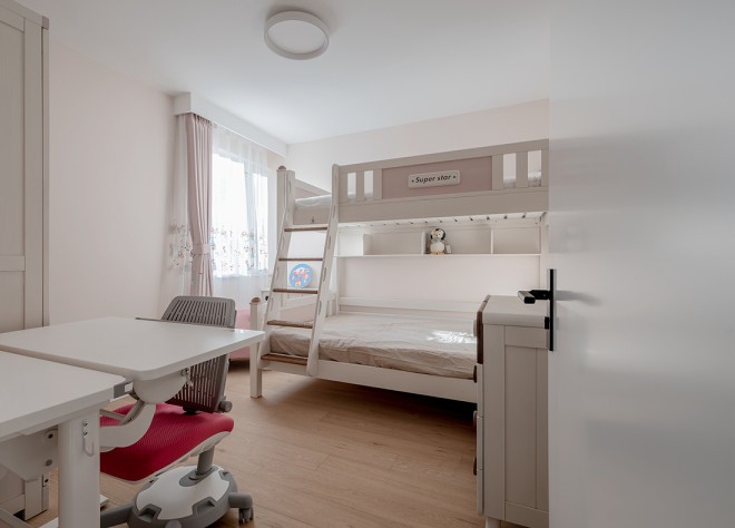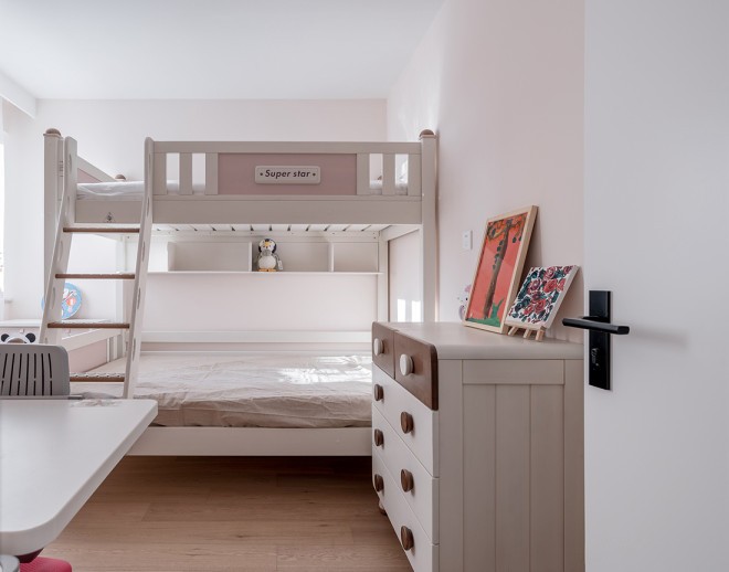 次卧儿童房墙面刷成淡粉色,充满公主气息。 床铺采用高低床设计,颜色用白色与原木色搭配,和整体装修风格呼应,下铺可以充当临时客房使用,如果以后考虑二胎,也不需要重新进行装修。