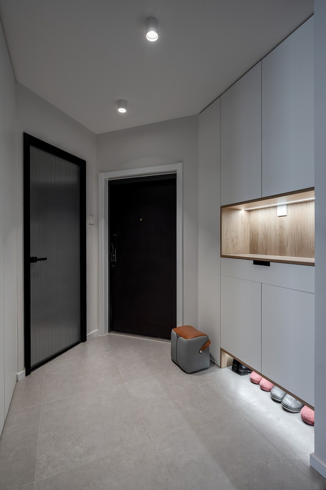 进门左手边是专门定制的玄关柜,柜门采用无把手的按压式,视觉上更加干净利落。 柜体中间留有空间用来放置随手物品或者摆放一些小装饰,底部留空设计可以用来放置经常穿的鞋子。