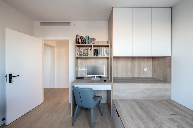 书房在用作办公区域同时,又可以供长辈来访时居住,在温馨舒适的整体调性下,尝试新事物,凸显长辈年轻的心态。 以暖灰色为基调,搭配浅米灰的背景,简约又大胆。