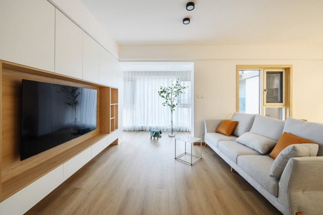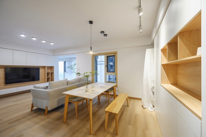 由餐厅向客厅视角,整个空间色系由大面积白色与局部木色构成,敞亮通透,略显拥挤的公共空间在视觉感受上变大了。为了增加储物,电视墙是整壁白色柜子构成,电视与旁边的木色架子组合增加了视觉趣味性。公区整体不做吊顶,保证层高与简洁性。客餐厅采用无主灯设计,一组明装筒灯保证了空间照明。