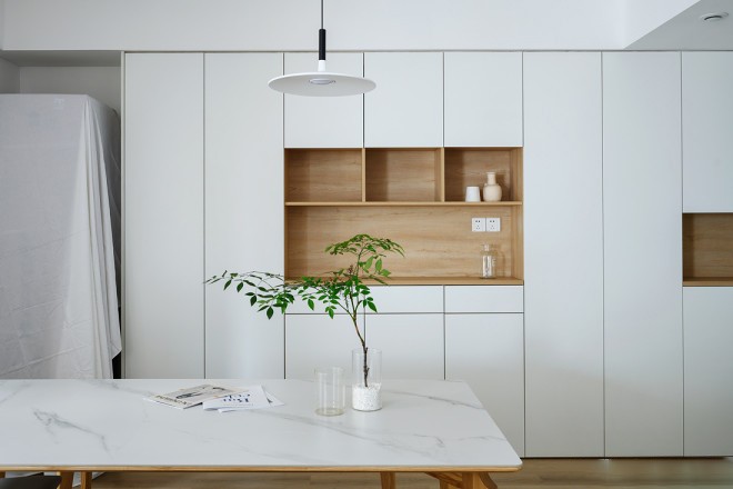多功能柜是到顶整壁贯通,为了缓解视觉上的紧张感,采用大面积白色与局部原木色搭配,造型简洁,与整体空间融为一体。正对餐桌的架子实质上起了水吧台与备餐柜的作用,设置电位可放置咖啡机水杯等小物件。