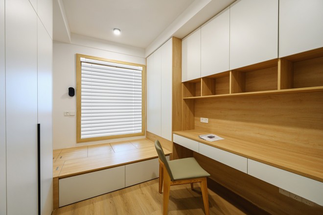 书房其实算是个多功能房,设置整壁到顶衣柜,作为主卧衣柜的补充,放置不当季衣物。衣柜对面是工作台及书柜,为了避免上吊书柜的紧张感,在工作台上部设置了开放的书架,视觉上也形成对比关系。靠窗位置是榻榻米,下置储物空间,家有访客,权当客房一用。白色与木色搭配,有趣不显拥挤。