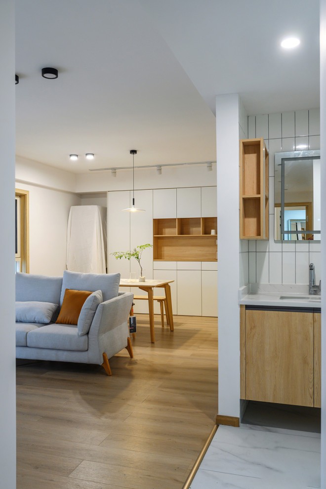 公卫借用客厅走廊空间设置洗手区,干湿分离得以达成,墙面竖条小白砖,地面仿理石白色防滑砖,与客厅木地板相对比。洗手区靠近客厅,对喜欢趴在地板上玩的小朋友的清洁问题是个利好。延展出来的洗手区其实也算主卧玄关,遮挡了客厅直达主卧门的视线。