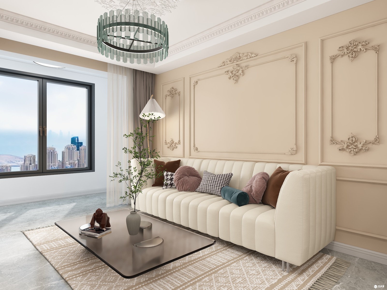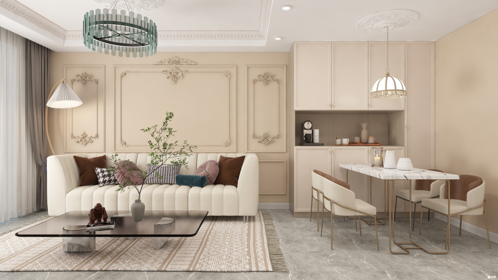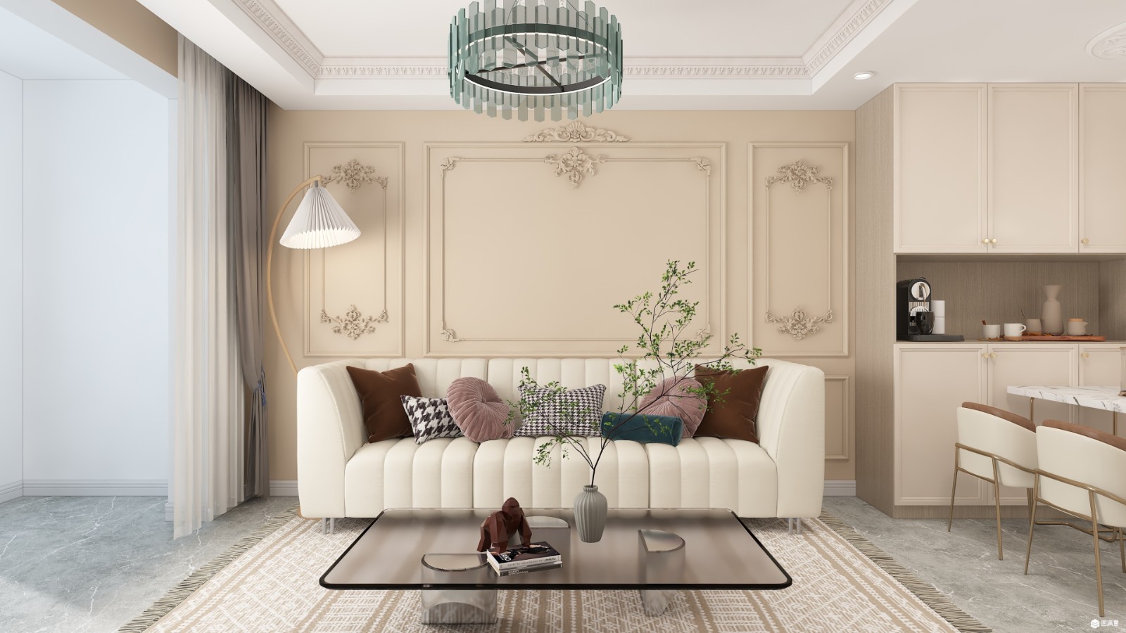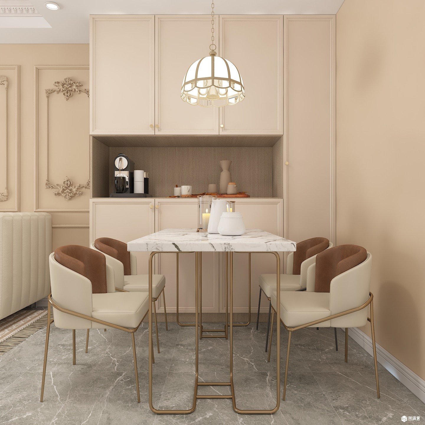 法式浮雕花纹做墙面造型,奶咖色的墙面让素色墙面增添一分温度,淡雅的色彩更是空间的灵魂。