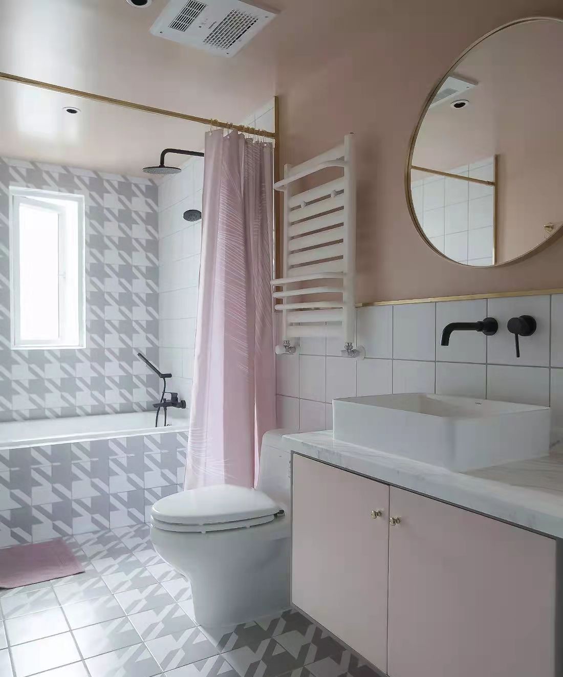 轻盈的粉色贯穿于卫生间,千鸟格纹瓷砖从地面延伸到墙面,让空间更具仪式感和整体性。