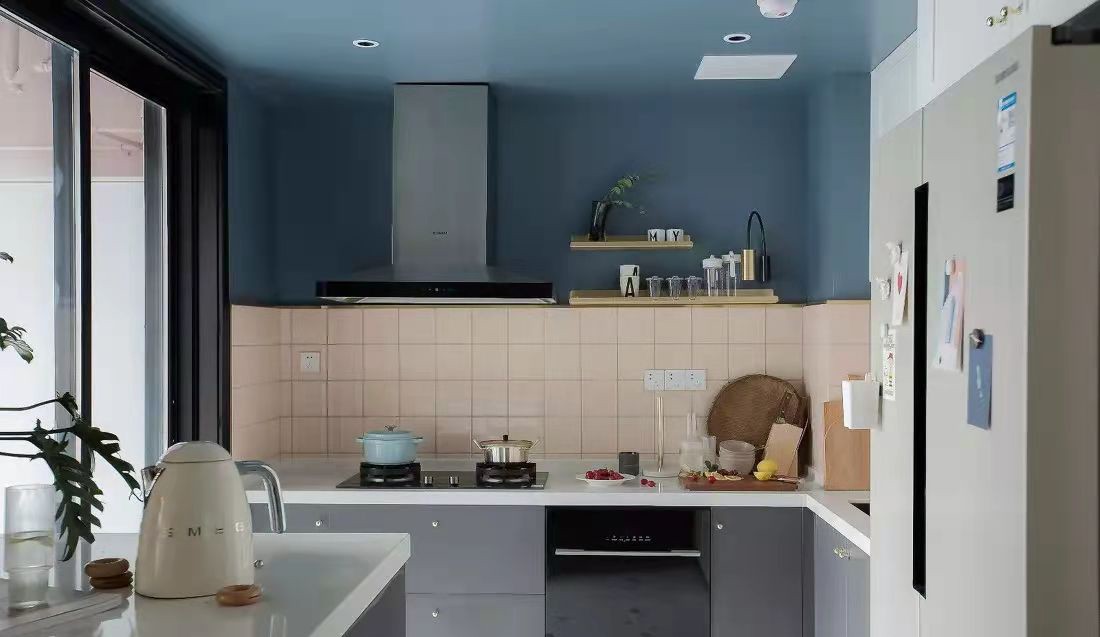 选用不同饱和度的蓝灰+裸粉,巧妙的用色彩划分空间层次,给厨房带来了几许趣味性。岛台背面做了内嵌式烤箱,在非料理时刻也可以做简餐台和备餐台用。