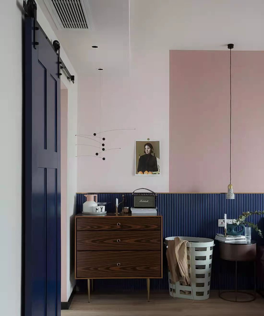 深蓝色的木质波浪板代替了传统的成品床挡。加上棕粉色的乳胶漆,增加空间的层次感的同时,又带来了无限的宁静与温馨。