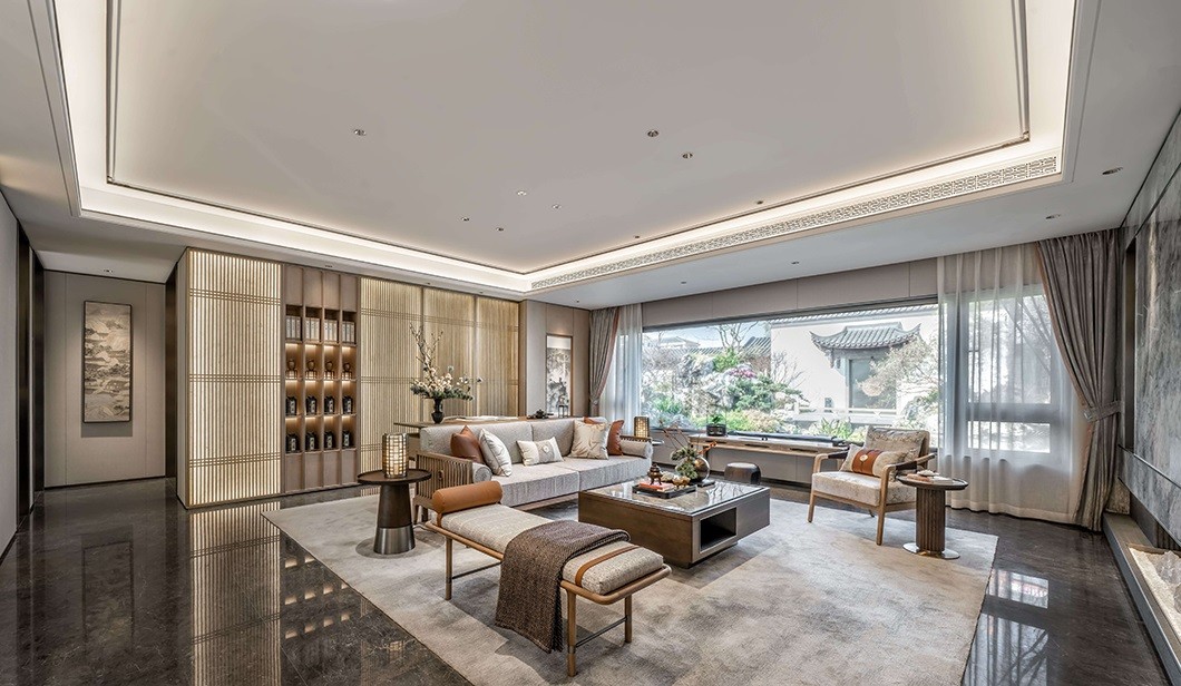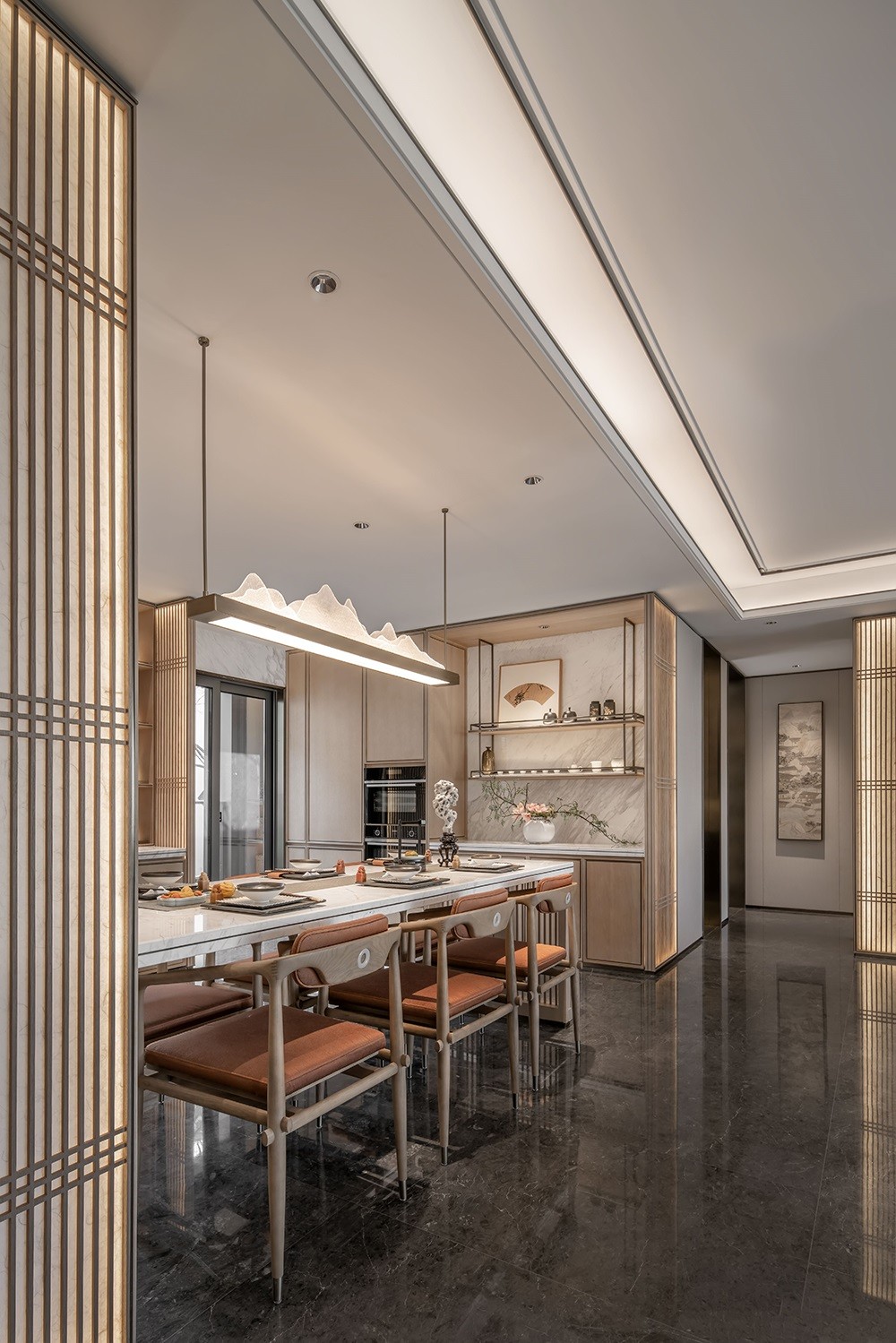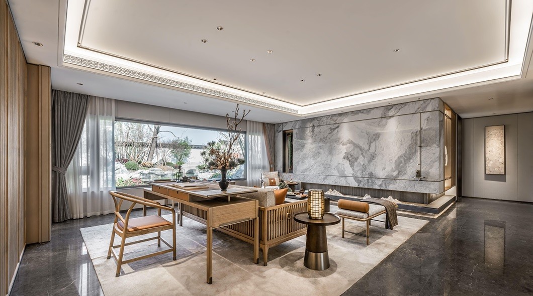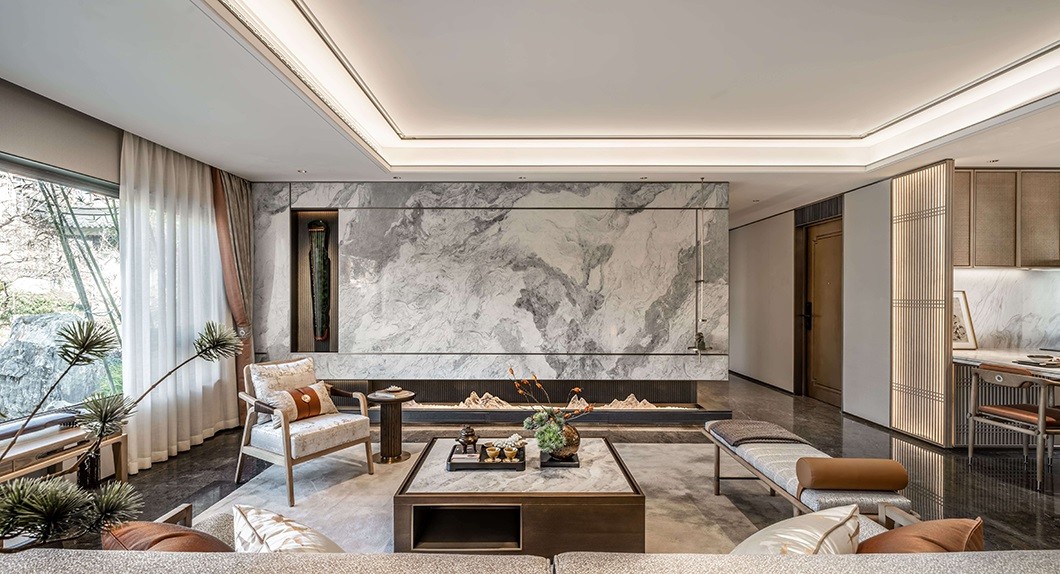 南北通透的宽阔客厅蕴含着诗书之气。山、水气韵流转,舍弃形式反归本源;酣畅简笔勾勒,融湖石嶙峋、茂林修竹于石纹背墙和金木格栅的虚实遥应间。