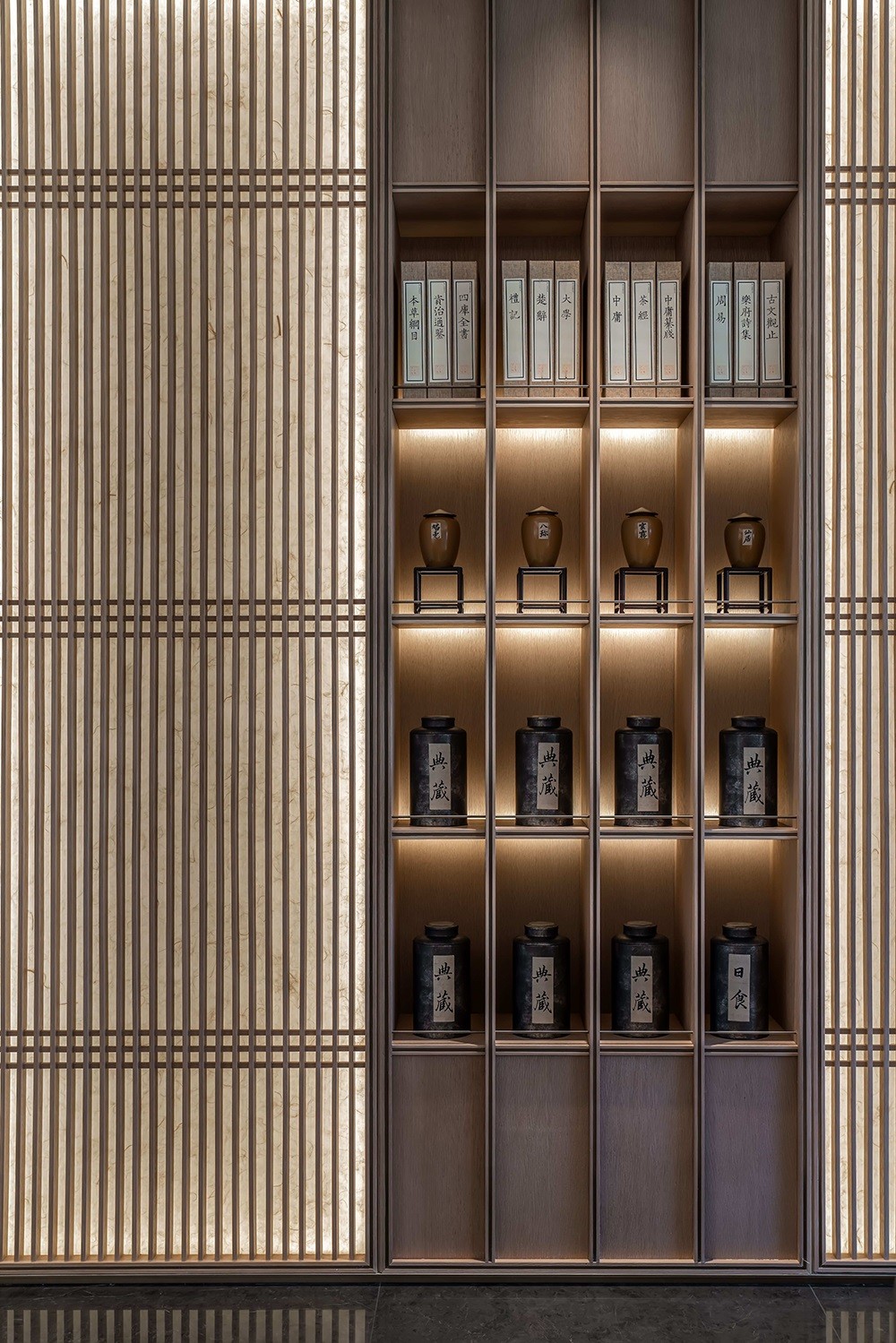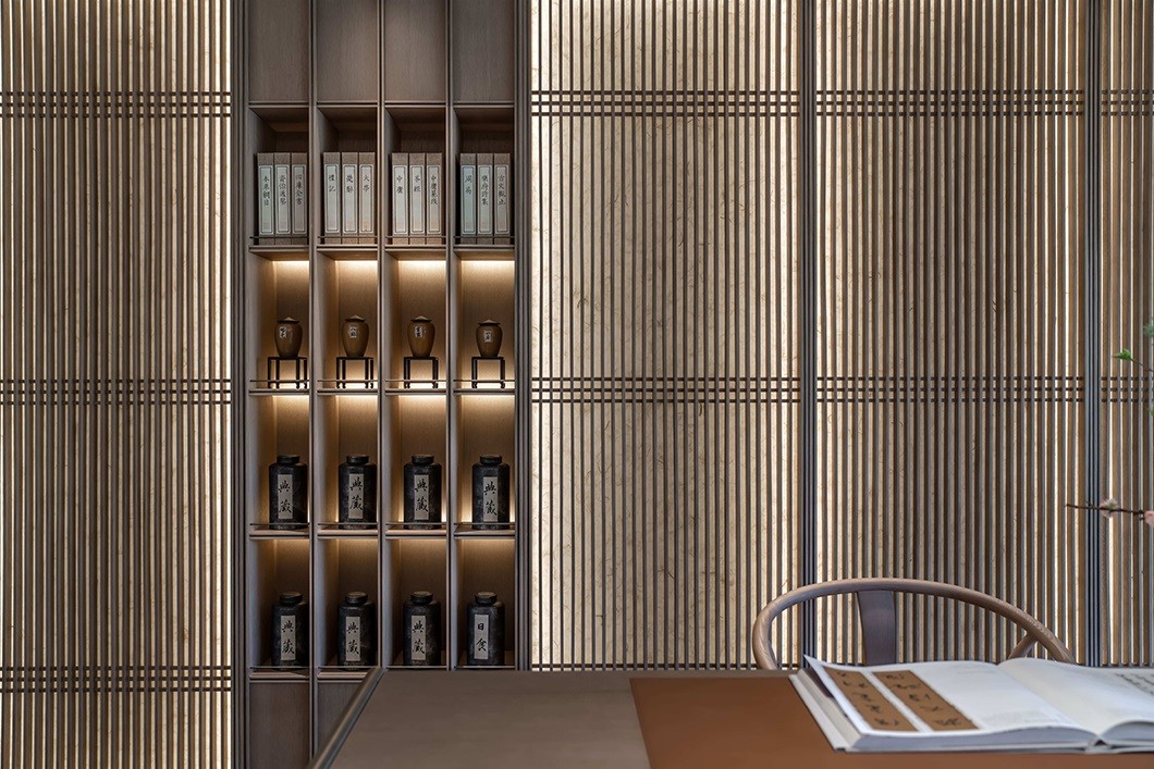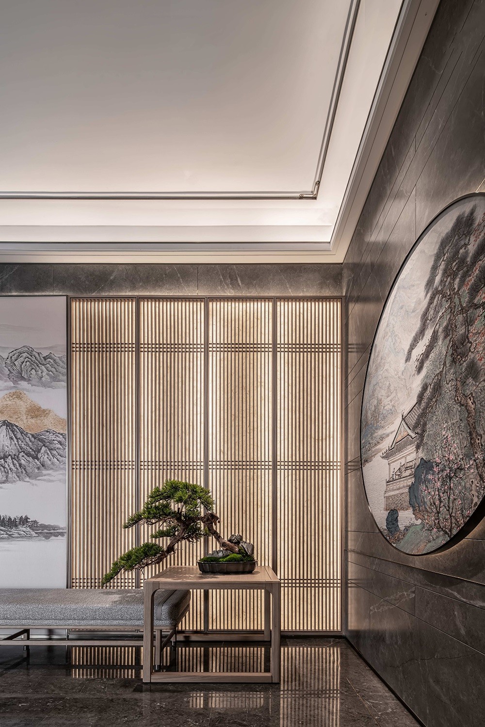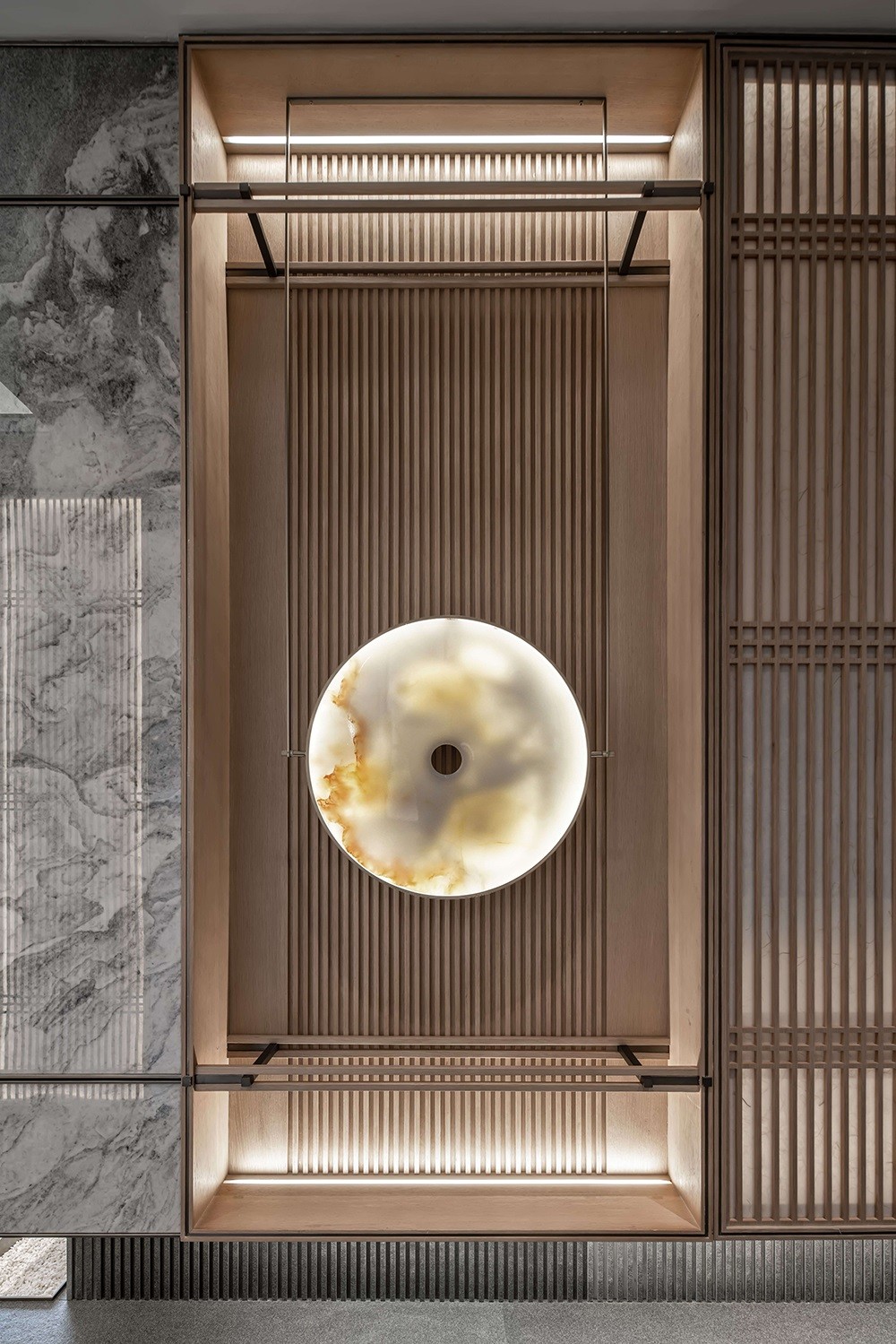 玄关处,以一面肌理丰富,质感通透的玉盘开篇。壁内凹拓而成龛,置玉璧以孕澄澈之气;木栅巧围,投光成影。方正秩序之下,空间氛围一片通融平和。