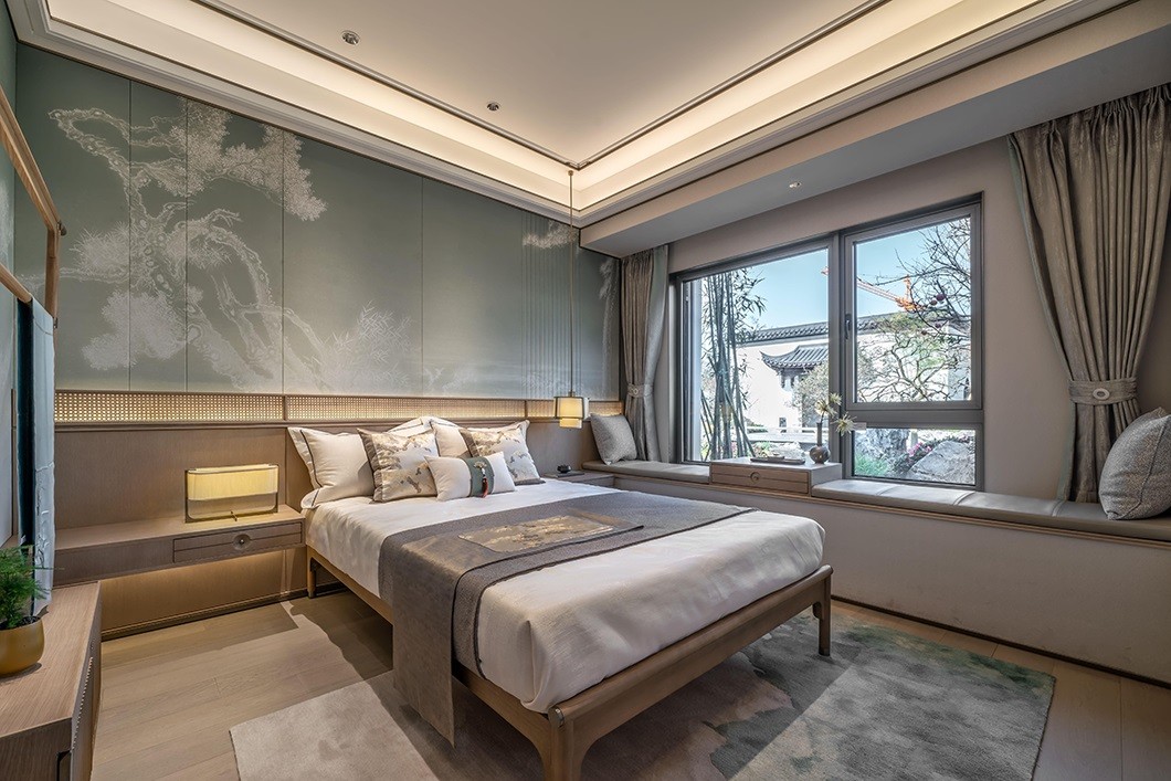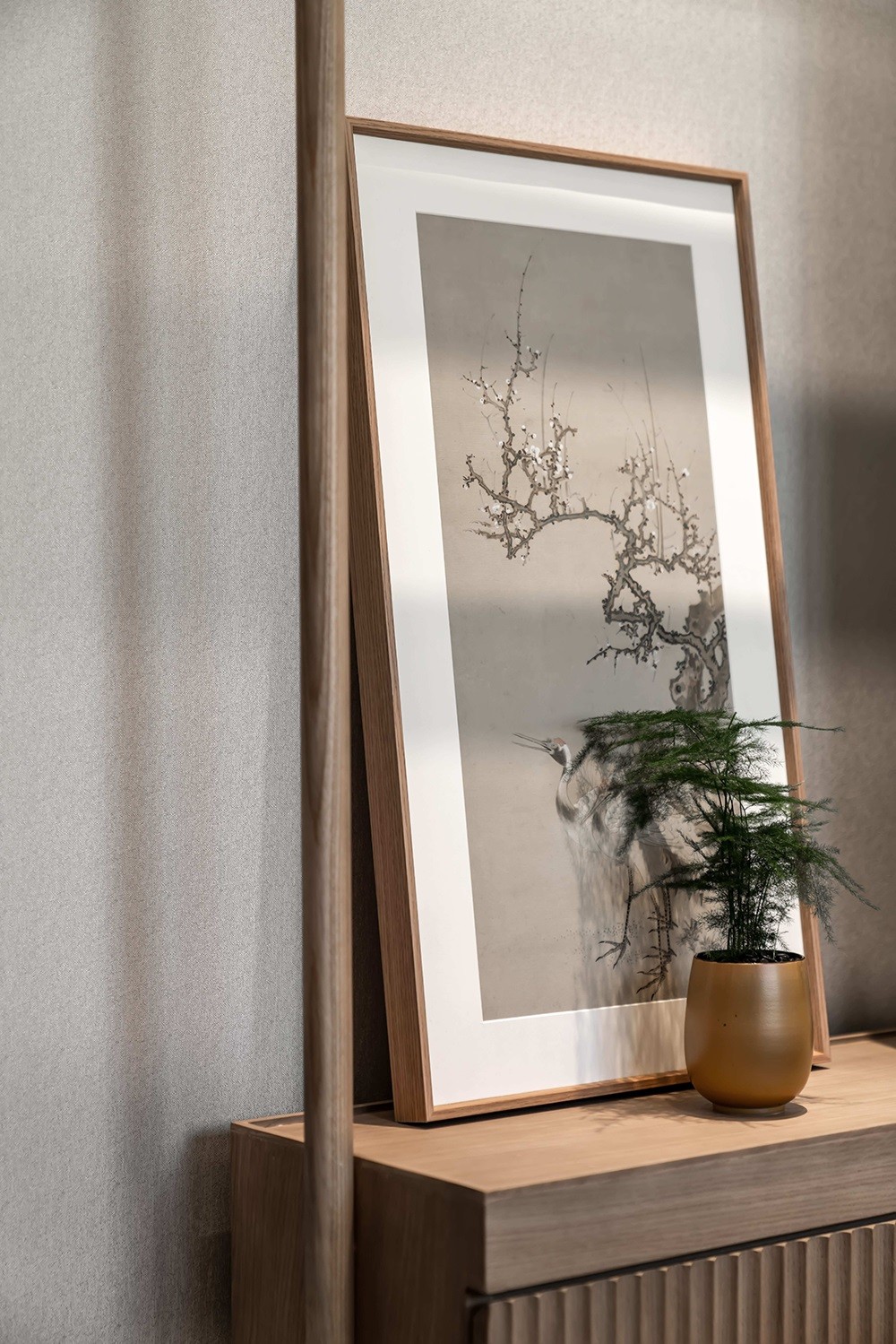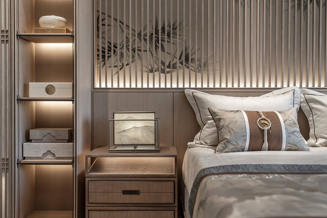 主卧中,物象共鸣。自然世界中的灵动清秀与古朴和谐一齐入室。内与外、人和自然的分明界限逐渐消隐,化归于和煦沉浸的氛围体验。