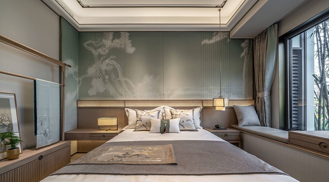 古风床屏,竹雀格栅,灵秀吊盏,中式装饰与温润柔和的木色相融,间夹着冷调黛青的淡然悠远。