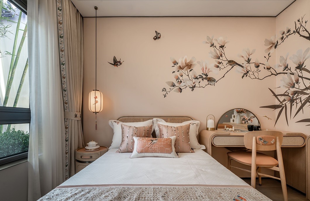 女儿房中,蝶化为意象。背景墙如一幅工笔,逸趣自成间,暖调润泽,含蓄美好。