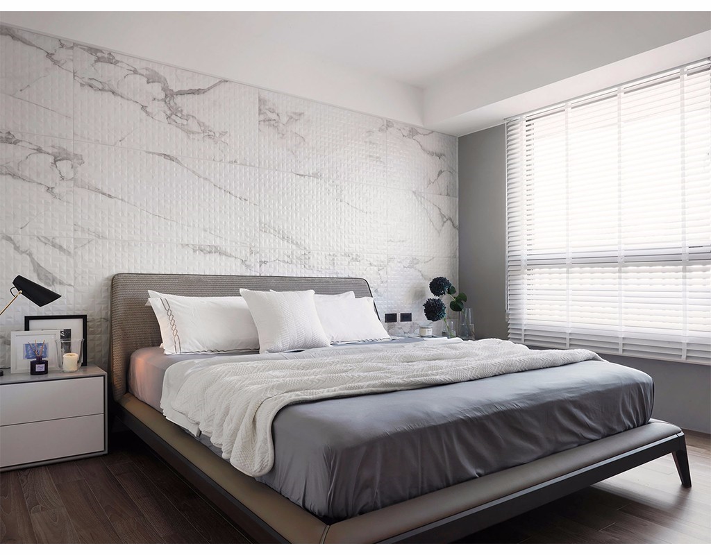 卧室的床头是大理石作为背景,给人一种山高流水的雅致,整体也是非常简单的,配***调也比较少,但是很大方。