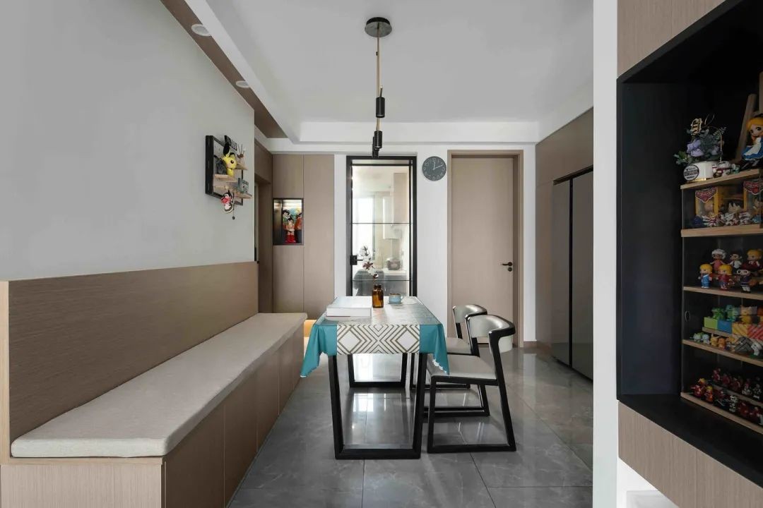 餐厅定制了卡座式设计,既能容纳更多人就餐,下面还有不错的收纳功能。一侧墙面定制了整面墙的餐边柜,并将冰箱嵌入进去,大大提高了空间利用率。
