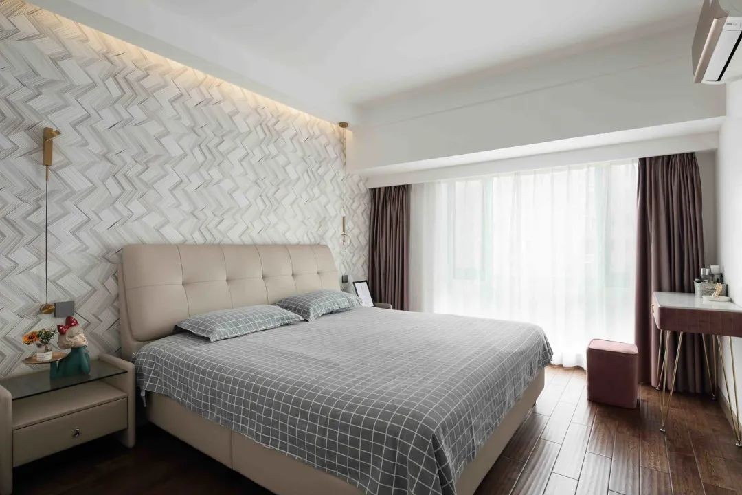 主卧,床头背景墙铺贴了线性墙纸,搭配两侧不对称的吊灯,上面还有隐藏灯带,现代感十足。