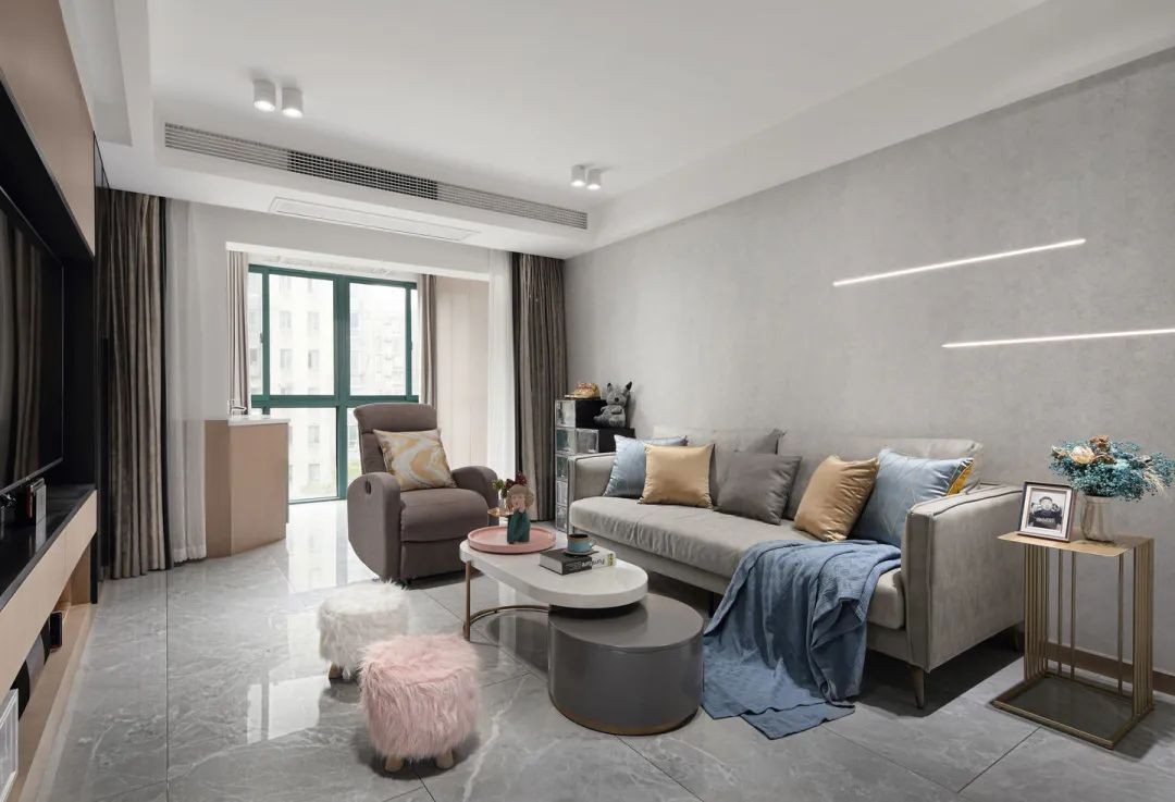 客厅,打通阳台包了进来,既扩大了使用面积,还在视觉上更显宽敞通透。整体采用无主灯设计,用隐藏灯带+线性灯代替,让整个空间更有氛围感。电视墙定制了嵌入式收纳柜,开放格与封闭柜的组合,藏露有序,***感十足。
