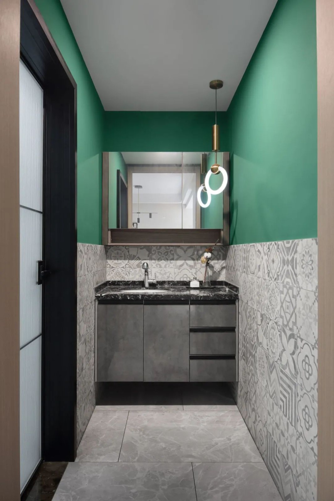 卫生间,将洗手台外移,做彻底的干湿分离,解决了早晨抢厕所的问题。干区采用分墙设计,花砖搭配墨绿色墙漆,瞬间充满了质感~